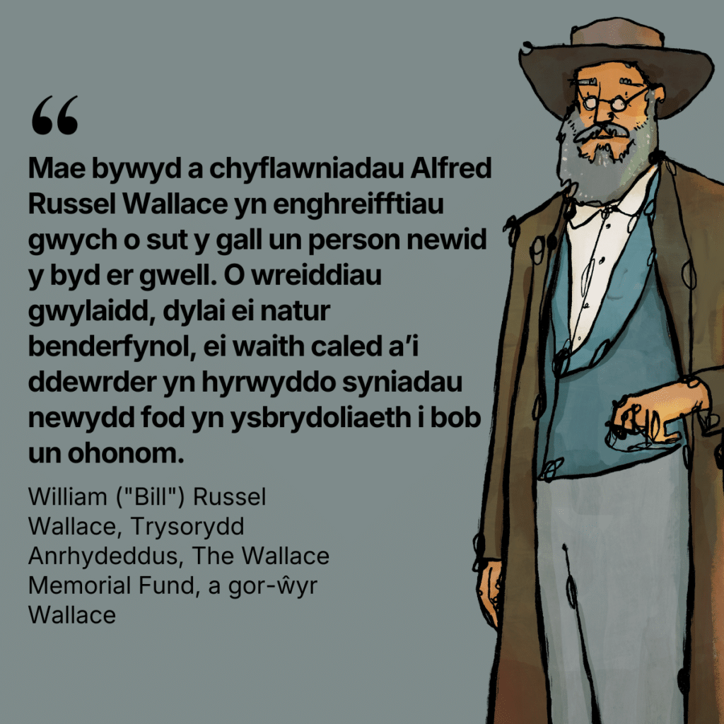 Mae’r fedal ar gyfer rhywun sy’n gweithio mewn Biowyddorau a Meddygaeth. Datblygodd Wallace y syniad o ddetholiad naturiol yr un pryd ac yn annibynnol o Charles Darwin. - Medal Megan Lloyd George (dyfarnwyd gyntaf yn 2027)