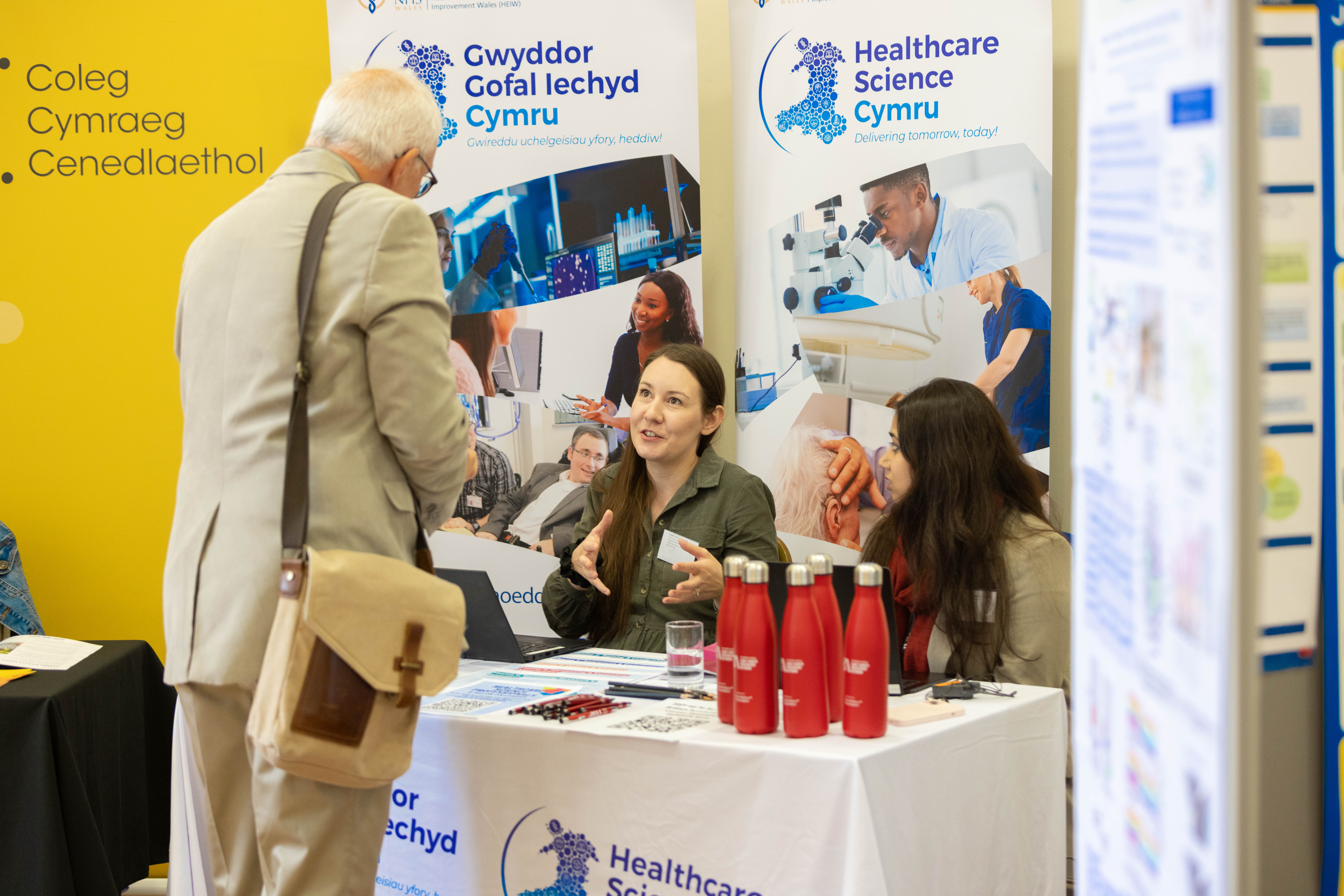 - Stondinau arddangos o’r Coleg Cymraeg, Addysg a Gwella Iechyd Cymru (AaGIC) a Rhwydwaith Ymchwil Gyrfa Gynnar yr Academi Brydeinig.