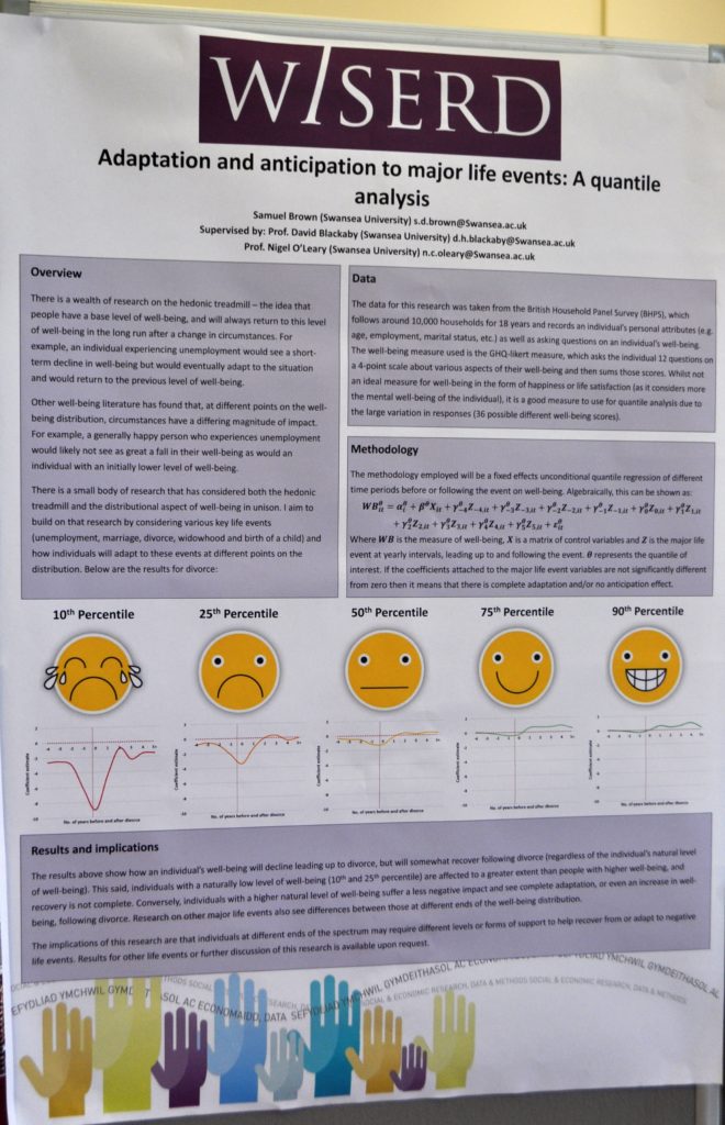 Dywedodd yr Athro Chris Taylor: “Denodd gwobr poster WISERD eleni gystadleuwyr cryf o brifysgolion ar draws Cymru, ond roedd poster Samuel yn dangos tair nodwedd bwysig poster llwyddiannus – cryno, gweladwy a hygyrch. Roedd ei boster yn cyflwyno canlyniadau ar un agwedd o’i waith yn unig – ysgariad – gan ddefnyddio ffordd effeithiol iawn i gyfleu’r canlyniadau hyn mewn modd gweledol a hygyrch.”
